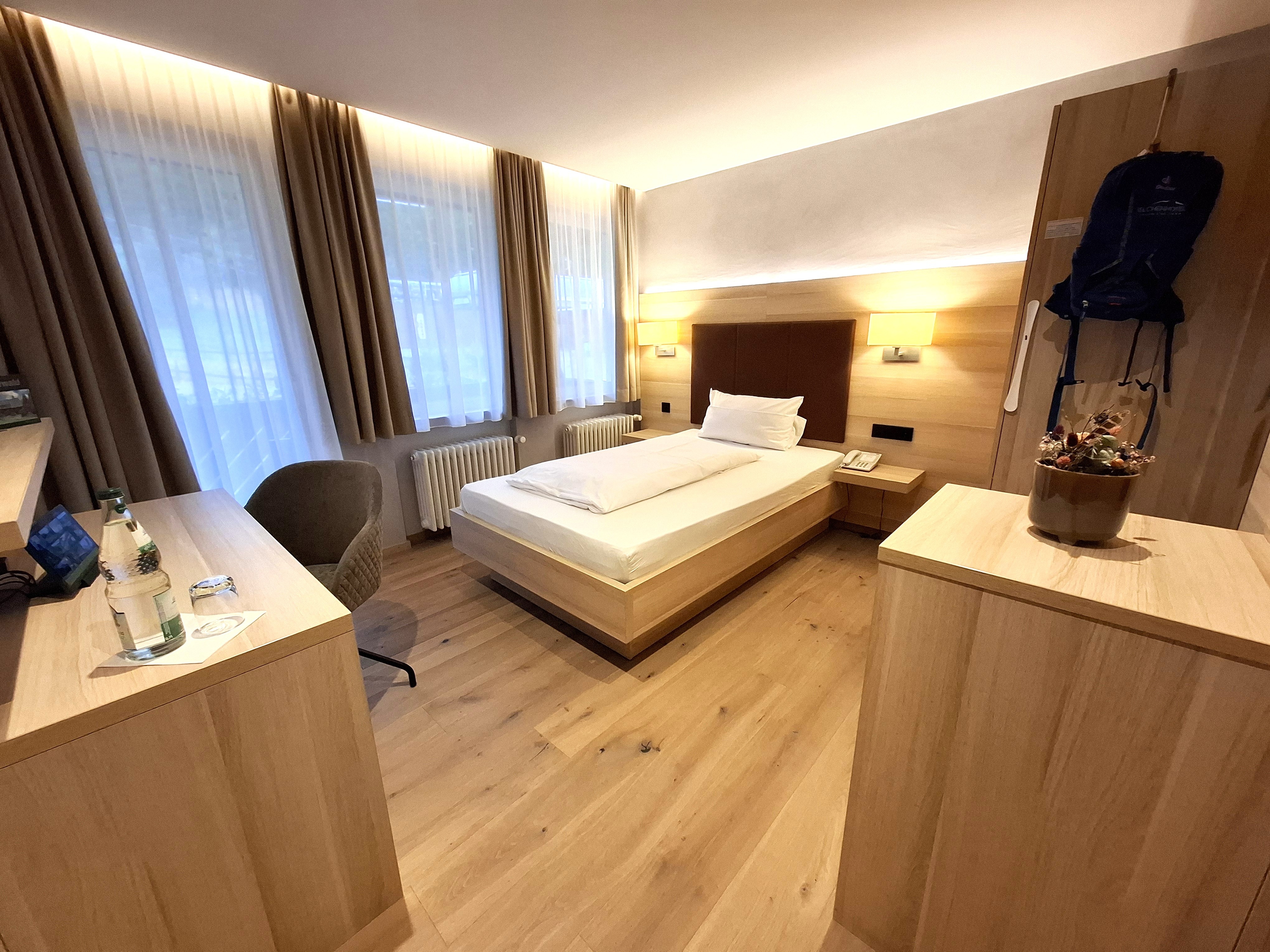 Einzelzimmer mit gemütlicher Sitzgelegenheit, Flachbildschirm, Telefon, Safe, Wanderrucksack, Internet- Tablet, Kühlschrank, WLAN, Balkon.